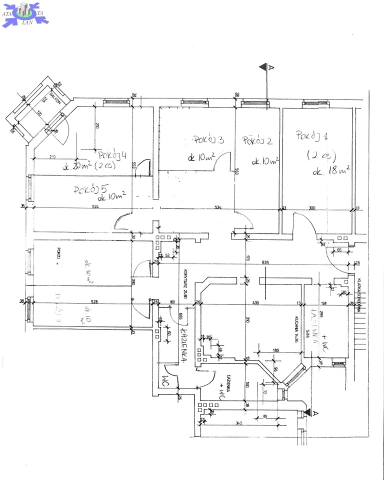 Układ mieszkania 7 pokoi (2 dwuosobowe, 5 jednoosobowych)