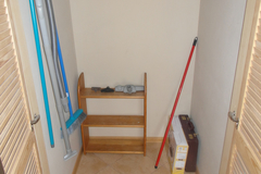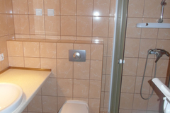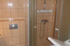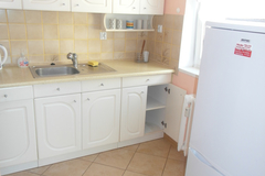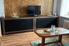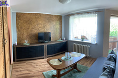 Mieszkanie składa się z większego pokoju o powierzchni 15m2 z wyjściem na duży balkon, maleńkiej sypialni 5m2, osobno kuchni 5m2 z oknem, łazienki z toaletą oraz przedpokoju. Mieszkanie oferowane jest do wynajmu po gruntownym remoncie. W pokojach na podłodze nowe panele, ściany gładzone i pomalowane w delikatnym kolorze (jedna ze ścian wykończona ozdobnym tynkiem strukturalnym). W większym pokoju znajduje się nowa, rozkładana kanapa dwuosobowa, stolik z telewizorem, dwie komody z szafkami i szufladami oraz obszerna szafa. W mniejszym pokoju znajdują się dwa regały z witrynami (typu POP) i łóżko. W kuchni nowe kafle na podłodze i fartuch kafelek na ścianach plus umeblowanie wykonane na wymiar w kolorze waniliowym, nowsza lodówka (na zdjęciu widoczna jeszcze starsza), nowa kuchenka indukcyjna, pochłaniacz oraz czajnik elektryczny. W łazience kafle na podłodze i kafelki na ścianach plus kabina prysznicowa, umywalka z blatem i szerokim lustrem wtopionym w kafelki oraz kinkietami, muszla podwieszana na geberycie. W przedpokoju kafle na podłodze (plus nowy wieszak na ubrania - na ścianie).