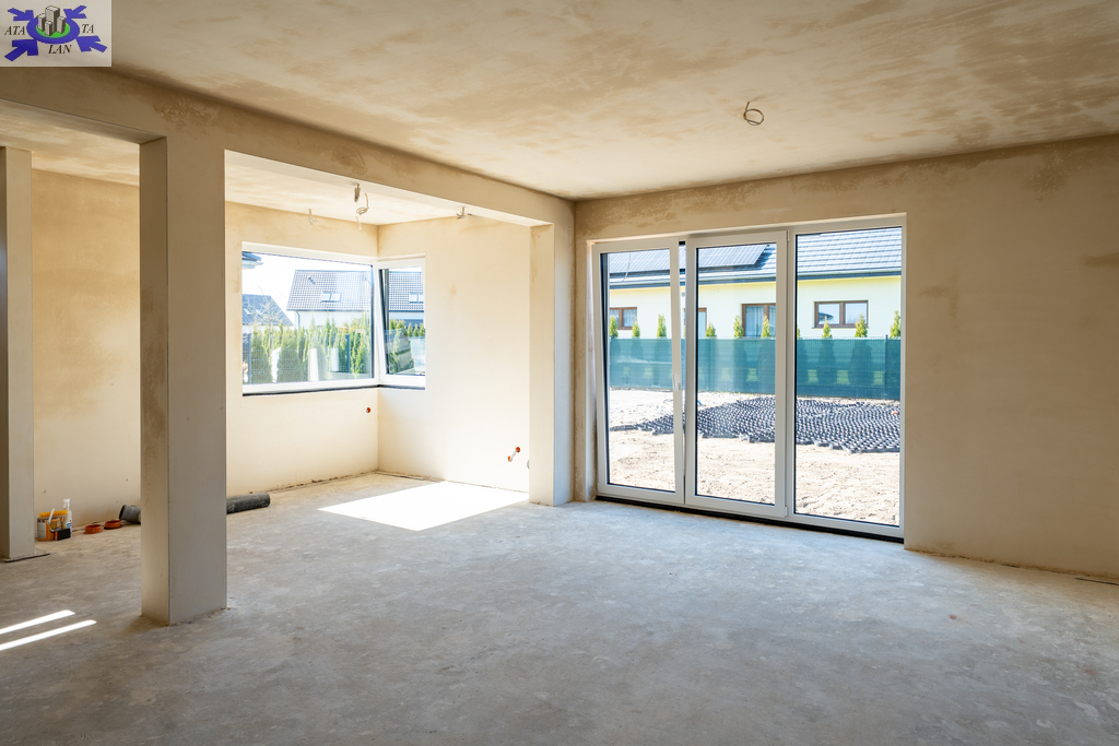 a. Poziom 1 przestronny salon z aneksem kuchennym i wyjściem na ogród (ok. 45 m2), łazienka oraz dwa ustawne pokoje.