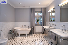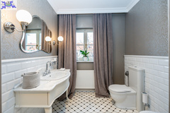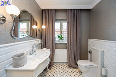 To wnętrze, które zachwyca dbałością o detal i ponadczasową klasą. Dominuje piękna, olejowana deska dębowa na podłogach, wysokie listwy przypodłogowe, sztukaterie ścienne i sufitowe, klasyczne proporcje pomieszczeń. Szaro-beżowa paleta barw przełamana głęboką zielenią i czernią, welurowe sofy, żyrandole w stylu glamour, kominek wolnostojący w salonie. Kuchnia otwarta na jadalnię w bieli i drewnie,. Łazienki wykończone marmurem i mozaiką w stylu retro (wanna wolnostojąca na lwich łapach, baterie w chromie).