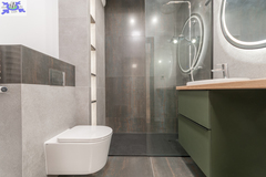 * łazienka wykończona w kaflach, z kabina prysznicową typu walk-in zabudowany geberit, szafka z umywalką,