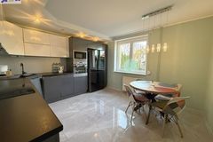 Kuchnia przestronna, z nowoczesną zabudową oraz sprzętem AGD, które pozostają w cenie (bez lodówki).