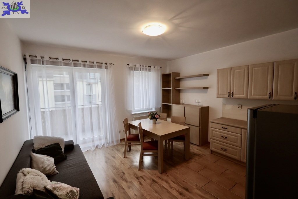 - Pokój umeblowany z kuchnią w aneksie i wyjściem na słoneczny balkon.