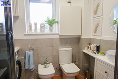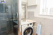 * łazienka z oknem oraz z kabiną prysznicową, bidetem, compactem i umywalką oraz pralką w glazurze i terakocie o powierzchni 11,5 m2