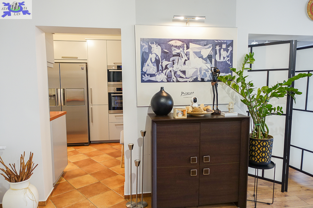 * kuchnia o powierzchni 11,7 m2 w zabudowie meblowej, na ścianach kafle z elementów metalowych, na podłodze terakota. Kompletne urządzenia AGD pozwolą na czerpanie przyjemności z gotowania zmywarka BOSCHA 60 cm, płyta grzewcza gazowa z 5 palnikami, piekarnik AMICA, piekarnik z mikrowelą SAMSUNG, pochłaniacz SAMSUNG, lodówka z kostkarką SAMSUNG, praktyczne ładowarki w kilku punktach, zlewozmywak, a pod nim pojemniki na segregowane śmieci, blat drewniany, cicho domykające się szuflady, obrotowe półki w narożniku tzw. LE MANS. Zlewozmywak posiada wylot do wody filtrowanej,