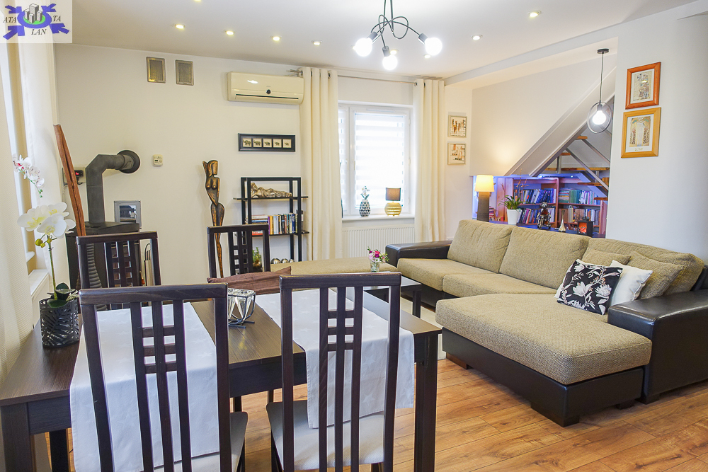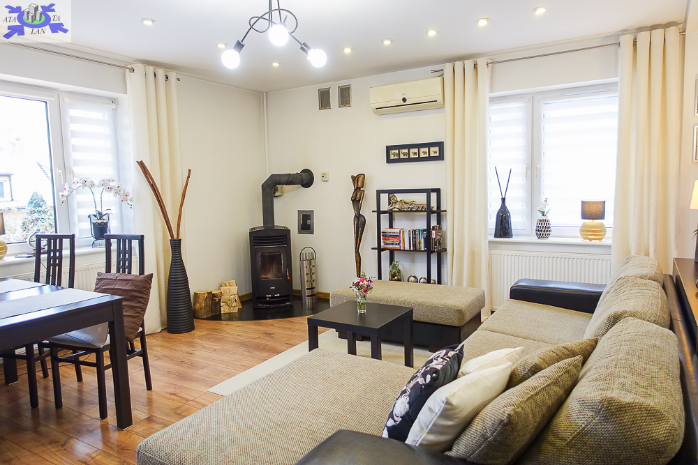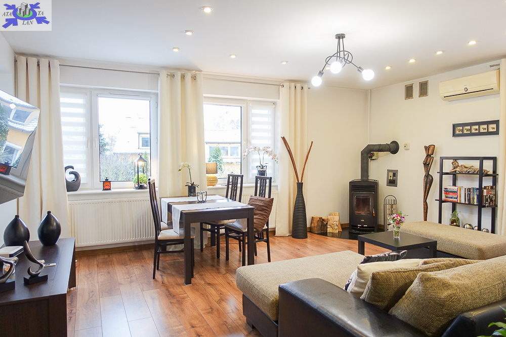 * salon 37 m2, otwarty na hall, pięknie doświetlony, z miejscem na wypoczynek i jadalnię, widok na ogród, wyjście na balkon i stamtąd kilkoma schodami do ogrodu, kominek z płaszczem wodnym uprzyjemni zimowe wieczory, ciepło rozprowadzane jest w całym domu.