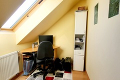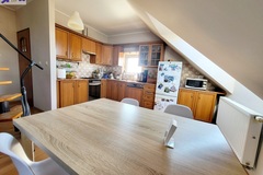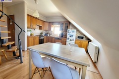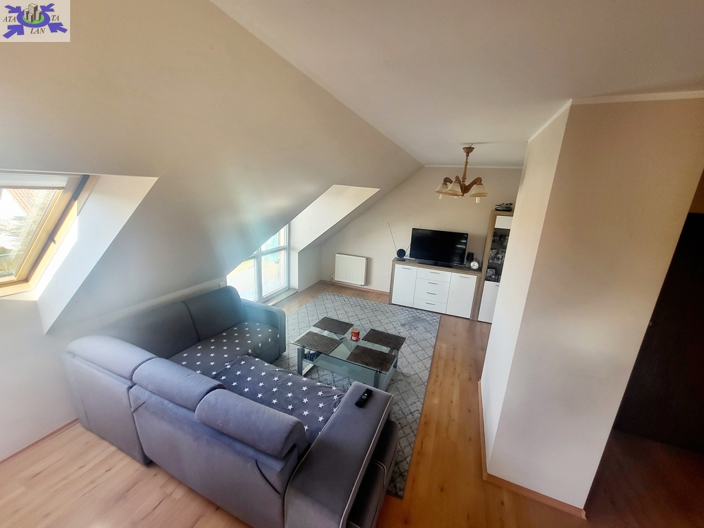 I piętro składa się z salonu z wyjściem na taras od strony zachodniej, aneksu kuchennego, łazienki z wc, w której znajduje się piec gazowy, przedpokoju, sypialni z przejściem do mniejszego pokoju, który pełni funkcję biura.