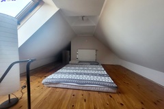 Schody prowadzą na II poziom gdzie znajduje się sypialnia, jest tam sporo przestrzeni pod skosami do wykorzystania np. pod garderobę.