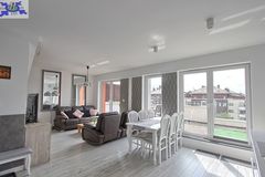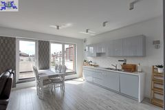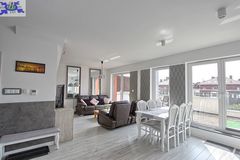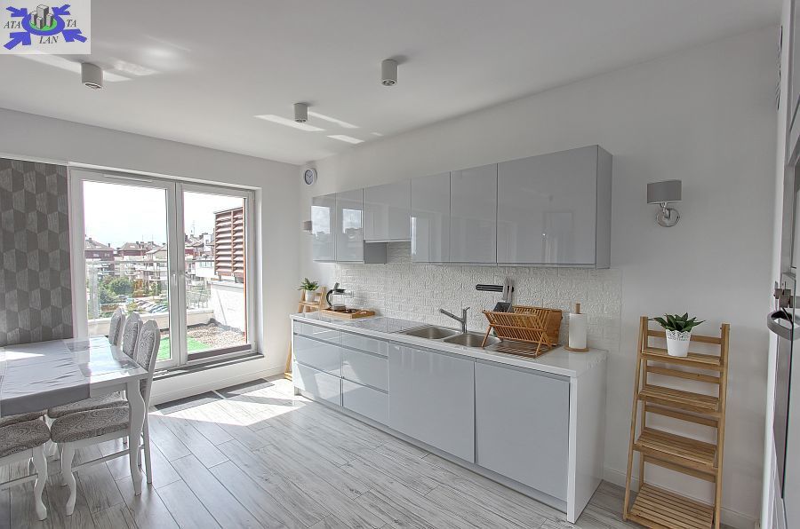 - Przestronny salon z otwartą kuchnią Stylowo urządzony salon z bezpośrednim wyjściem na duży balkon oraz otwartą kuchnią, wyposażoną w nowoczesny sprzęt AGD.
