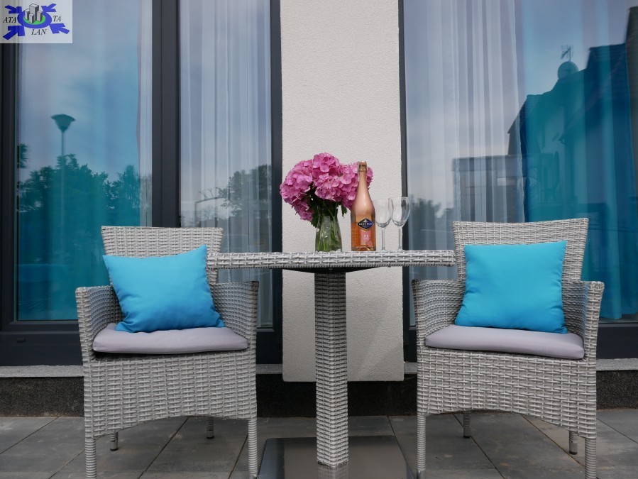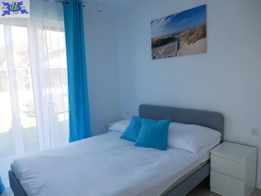 W każdym z apartamentów znajduje się w salonie kanapa, stolik kawowy, stół z czterema krzesłami, telewizor smart TV, w sypialni łóżko dwuosobowe, aneks kuchenny wyposażony w zabudowę szafek kuchennych, płytę grzewczą 2 - palnikową, lodówkę 60, oraz szafa dwudrzwiowa z lustrami. Ogrzewanie elektryczne podłogowe, jak również woda z pieca elektrycznego firmy Ariston sterowany zdalnie przez wi-fi. Meble ogrodowe oraz 4 miejsca parkingowe na działce.