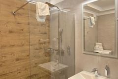Szafy w zabudowie, telewizor, wyposażona kuchnia, pralka, kabina prysznicowa w łazience.