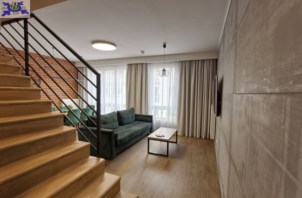 Mieszkanie 2 - poziomowe, z 2 sypialniami na drugim poziomie i częścią dzienną - salon z aneksem kuchennym na dole.