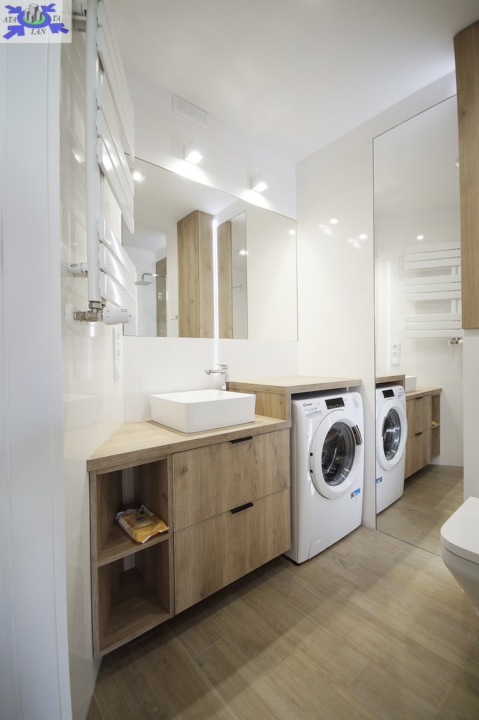 - Łazienka ok. 4 m2 uposażona w kabinę prysznicową, umywalkę, WC w glazurze i terakocie.