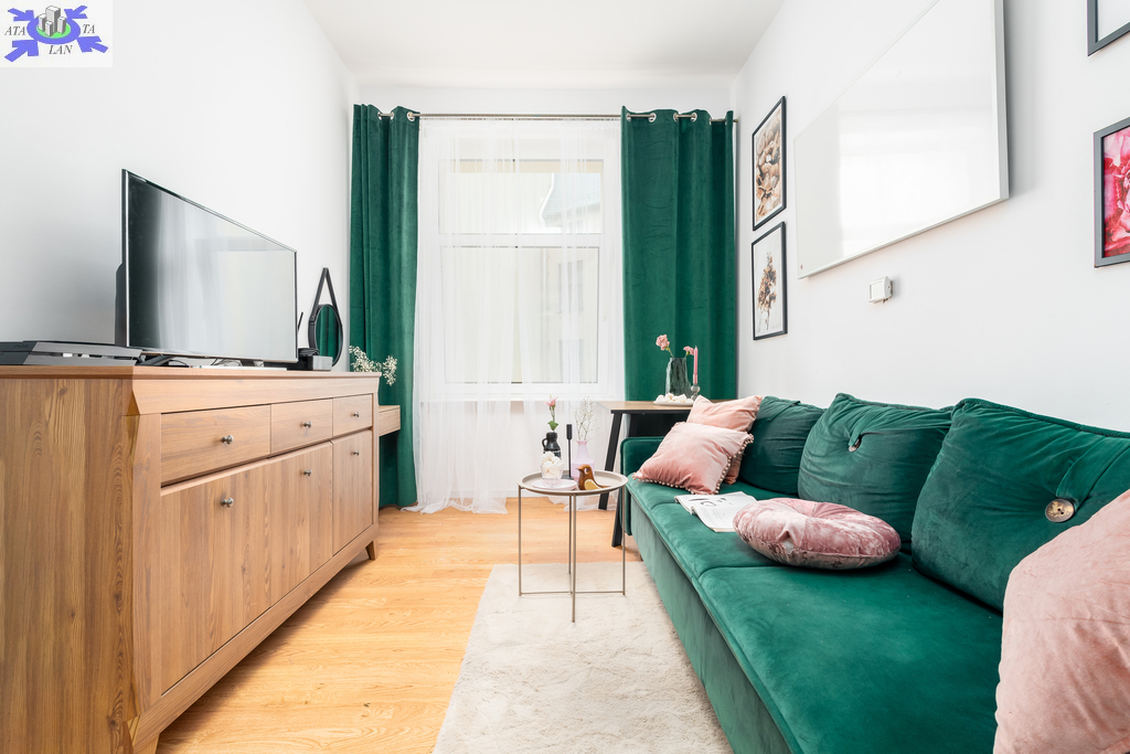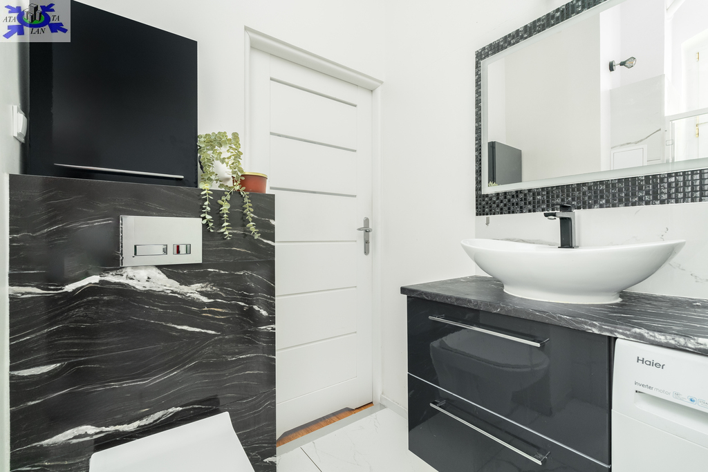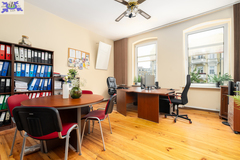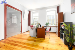 Strefa biurowa Dwa przestronne biura, idealne do prowadzenia działalności gospodarczej, dobrze doświetlone naturalnym światłem.Strefa mieszkalna Stylowa kawalerka z osobnym wejściem, przytulnym salonem z zielonymi kanapami i eleganckimi akcentami dekoracyjnymi.Kuchnia Nowoczesna, z pełnym wyposażeniem (lodówka, płyta indukcyjna, zmywarka) oraz eleganckim wykończeniem.Łazienka Wysokiej jakości wykończenie, komfortowa przestrzeń z nowoczesnymi urządzeniami.