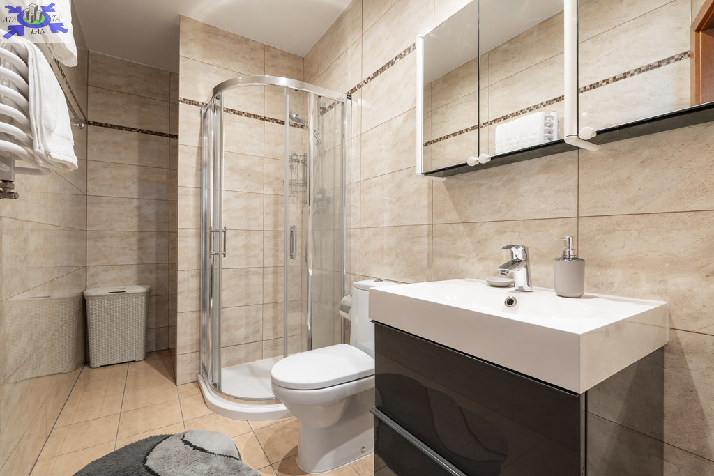Łazienki Dwie nowoczesne łazienki, wykończone w wysokim standardzie, z elegancką armaturą oraz stylowymi kafelkami. W jednej z łazienek znajduje się pralka i suszarka marki Miele, co zapewnia wygodę i funkcjonalność.