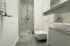 Łazienka z prysznicem, pralką.