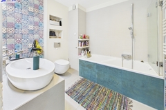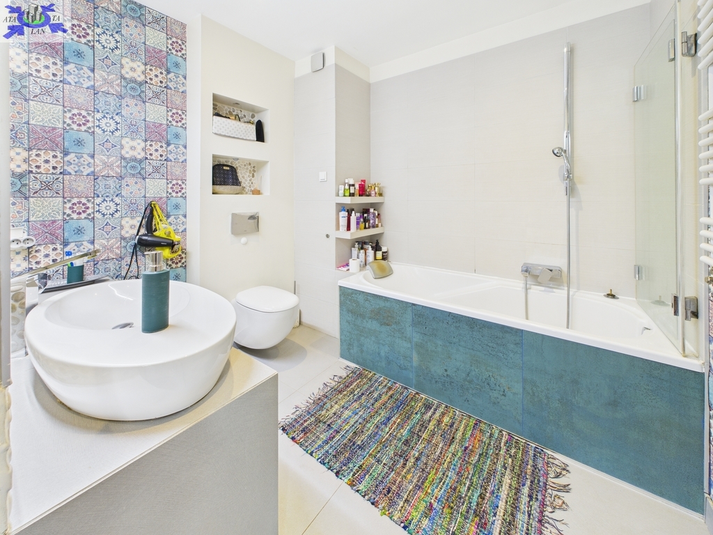 * Duża łazienka wyposażona w wannę, WC oraz dużą umywalkę