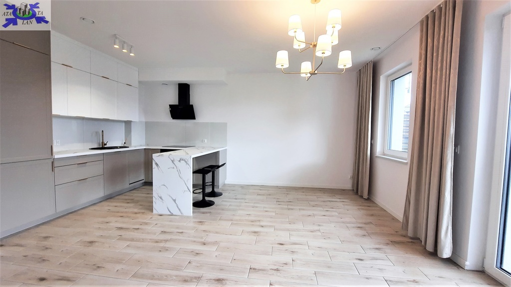 - salon z aneksem kuchennym (27,5 m2), kuchnia w zabudowie meblowej, wyposażona w sprzęt AGD (lodówka, zmywarka, płyta indukcyjna,