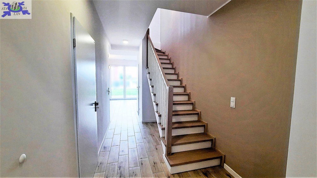 Wykończenie w jasnych, neutralnych kolorach. Na podłogach w całym domu gres imitujący deskę. Instalacja grzewcza podłogowa.