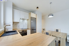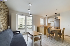 - przestronny salon z aneksem kuchennym wyposażonym w płytę, piekarnik, zmywarkę, lodówkę, zlew, okap i meble na wymiar, z którego mamy bezpośrednie wyjście na balkon. W salonie znajduje się rozkładana kanapa, komoda, telewizor oraz stół + 4 krzesła