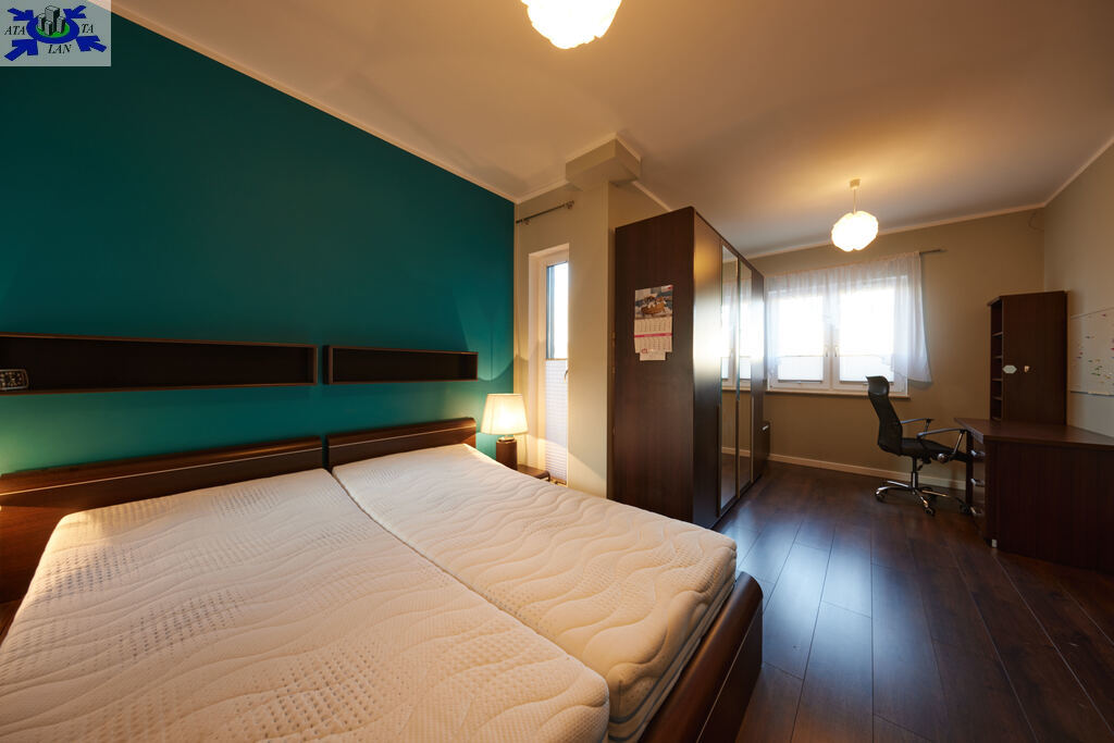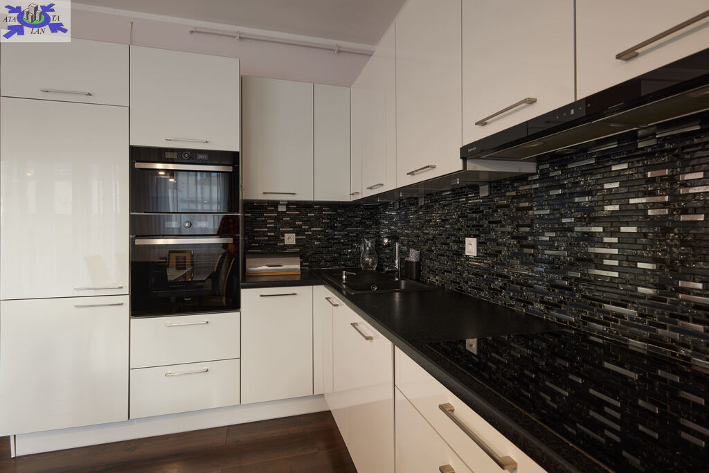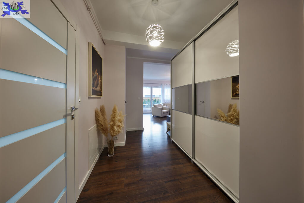 Na podłogach znajdują się panele klasy premium, a łazienka zachwyca gustowną aranżacją z dużą kabiną prysznicową. W części kuchennej zastosowano białą zabudowę meblową z czarnymi, kamiennymi blatami, co nadaje wnętrzu wyjątkowego, ekskluzywnego charakteru.