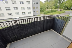 Układ mieszkania salon z aneksem kuchennym i wyjściem na przestronny balkon,