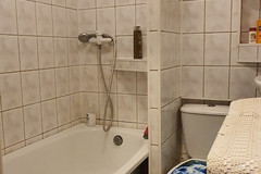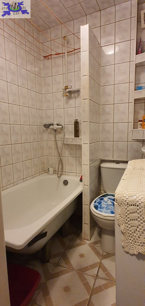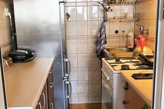 Łazienka z toaletą w glazurze i terakocie (pralka). Kuchnia w kafelkach, wyposażona w lodówkę oraz kuchenkę, szafki kuchenne.