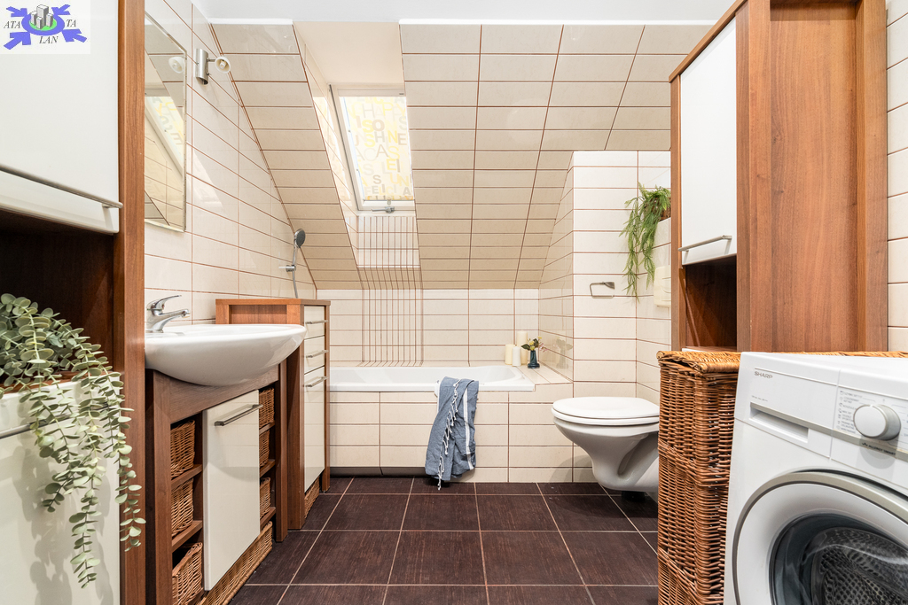 Relaks w łazience Przestronna łazienka z wygodną wanną oraz pralką.