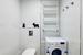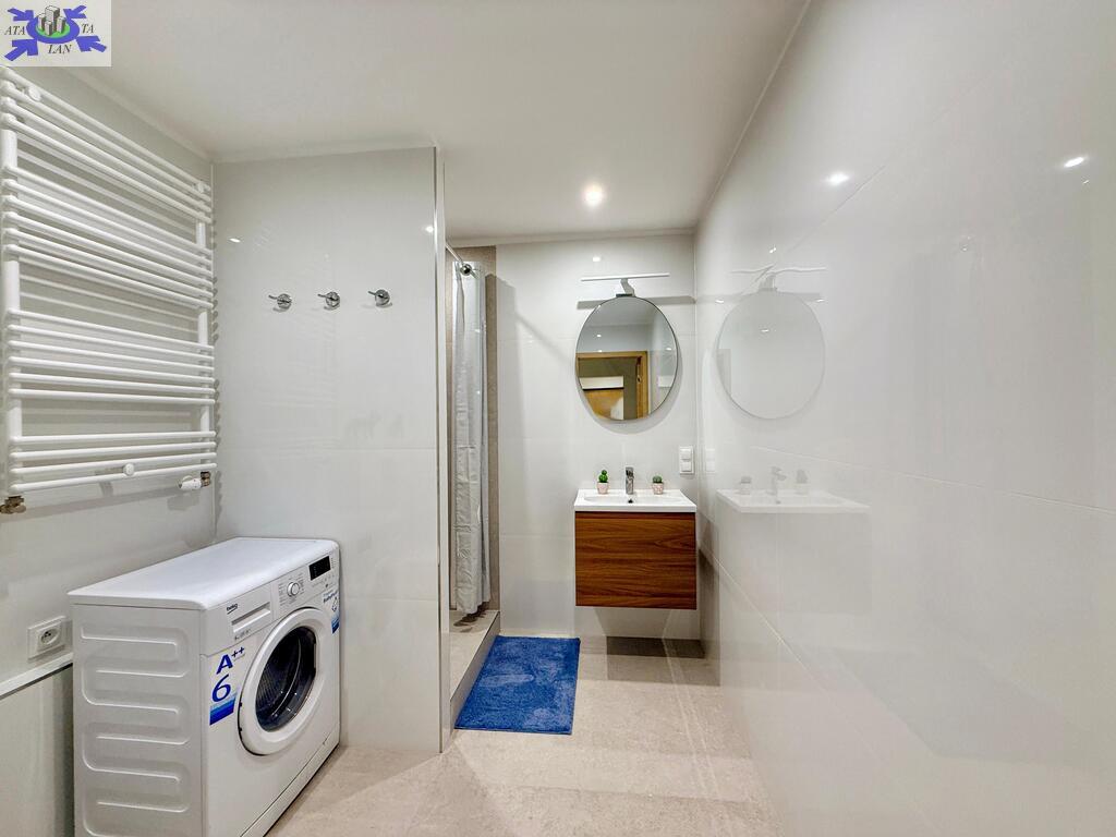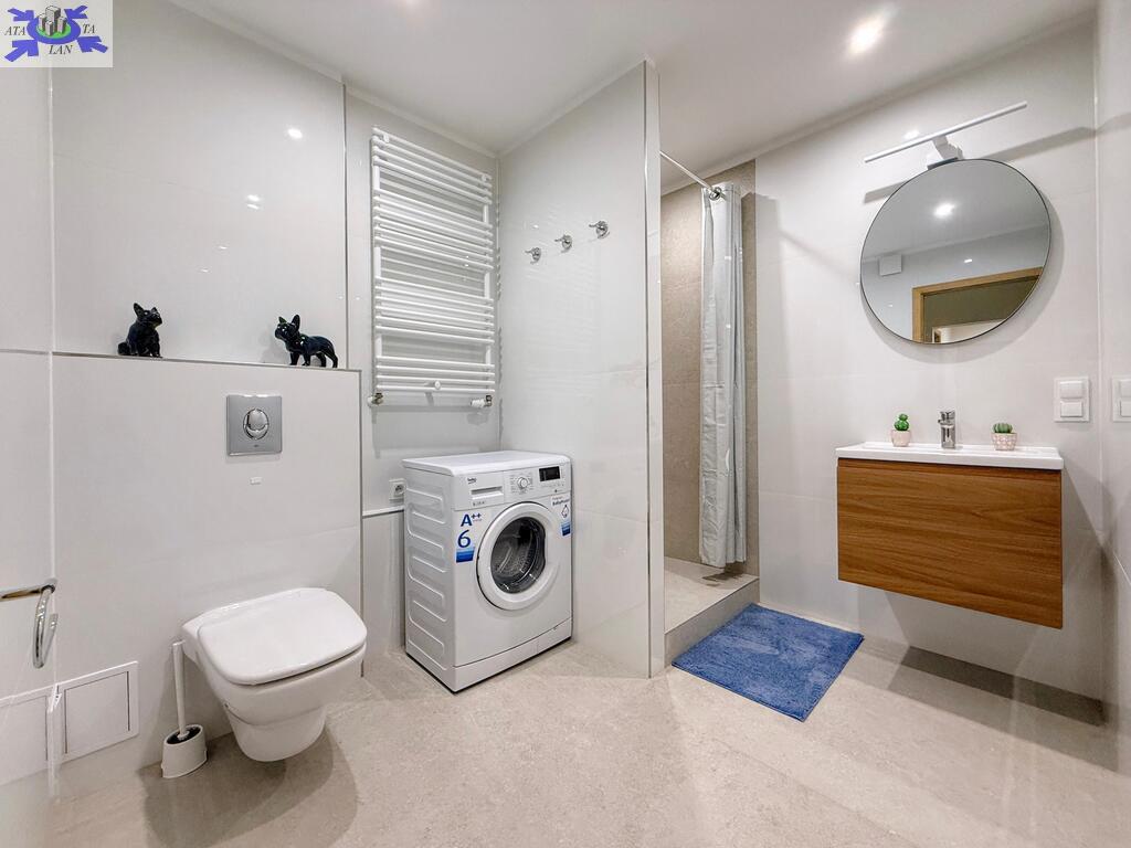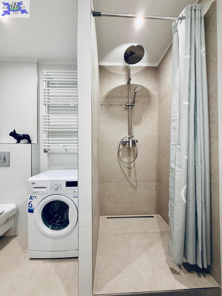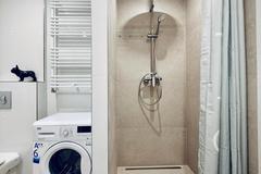 Łazienka wyposażona w prysznic, zlew, muszlę oraz pralkę automatyczną.